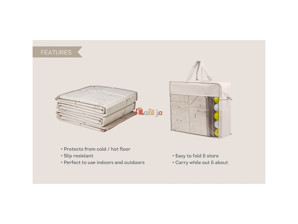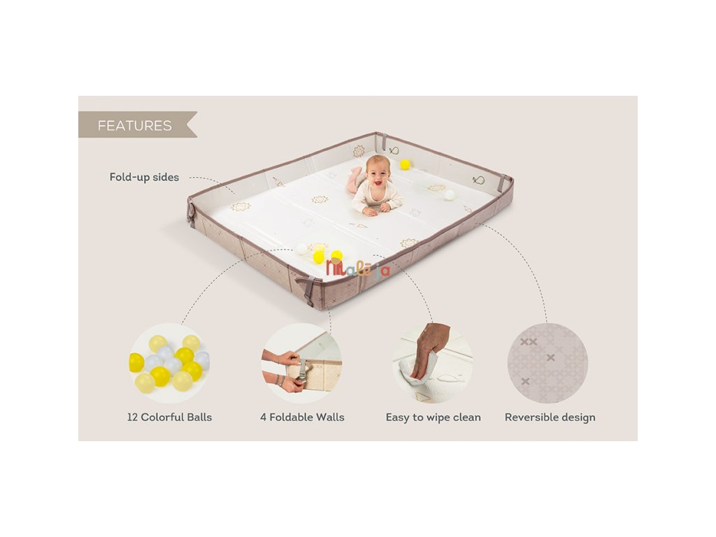 Extra veľká, obojstranná penová hracia deka vyniká svojou univerzálnosťou a pohodlím pre vás aj vaše dieťa od narodenia. Jedinečné zdvihnuté okraje vytvárajú bezpečnú, uzavretú hraciu plochu, udržujú hračky a loptičky na deke a poskytujú bábätku pocit bezpečia. Starším deťom okraje ľahko položíte, aby ste maximalizovali plochu na hranie.