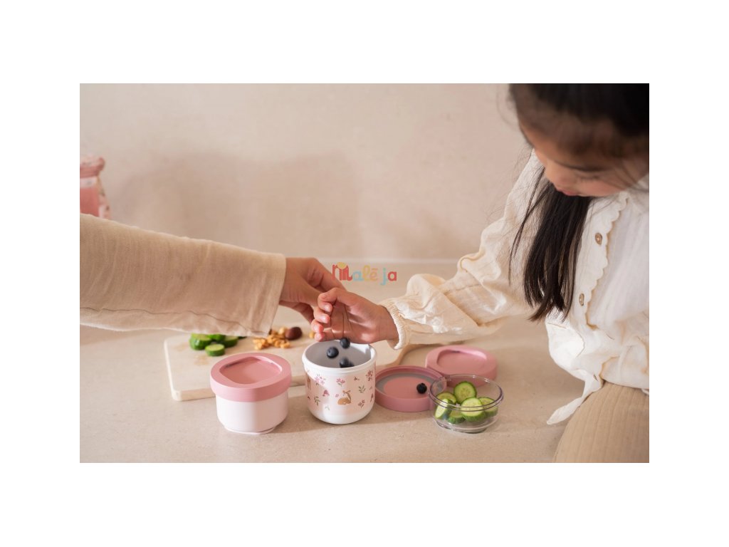 Tri praktické stohovateľné tégliky s viečkami sú ideálne na oddelené uloženie jednotlivých častí detskej desiaty. Spoľahlivé tesniace viečko chráni obsah pred vysypaním. Pre ľahké prenášanie sa tri tégliky pevne zacvaknú k sebe. Tégliky využijete na prechádzkach, výletoch aj doma.