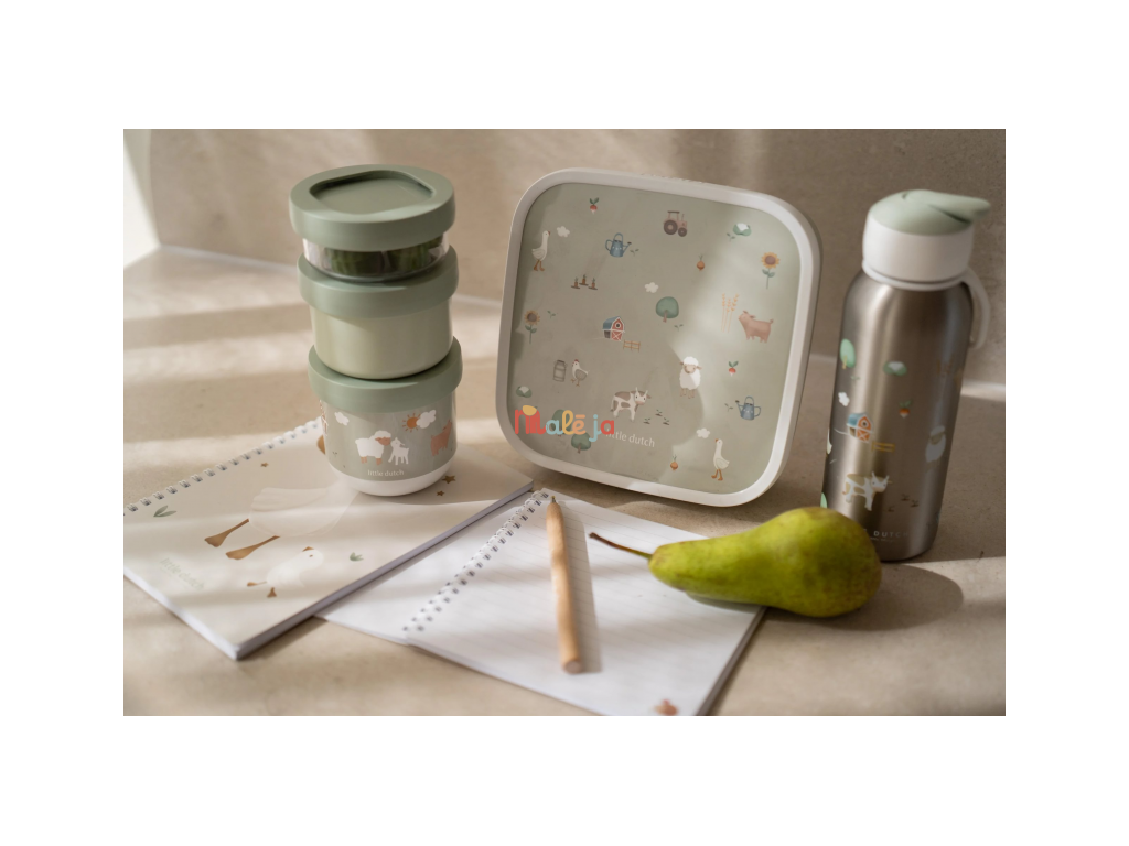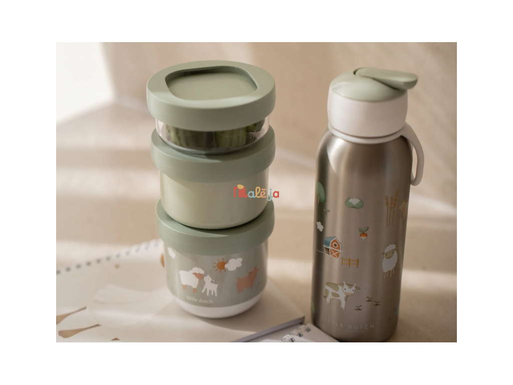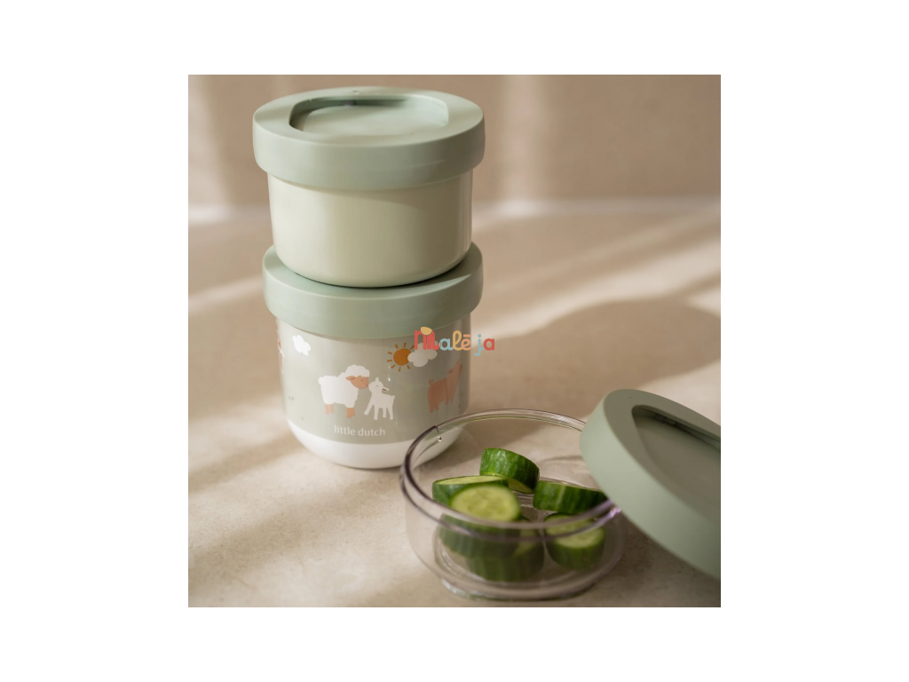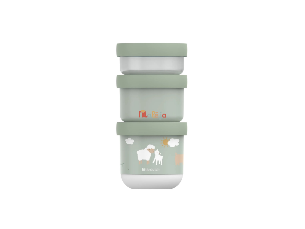 Tri praktické stohovateľné tégliky s viečkami sú ideálne na oddelené uloženie jednotlivých častí detskej desiaty. Spoľahlivé tesniace viečko chráni obsah pred vysypaním. Pre ľahké prenášanie sa tri tégliky pevne zacvaknú k sebe. Tégliky využijete na prechádzkach, výletoch aj doma.