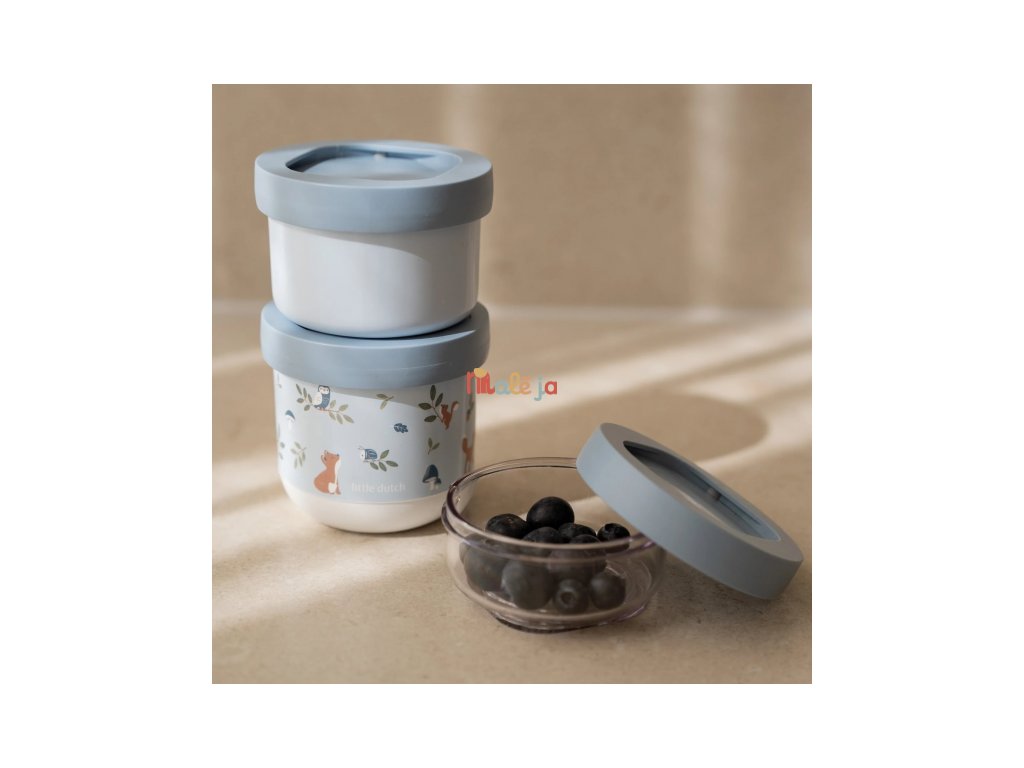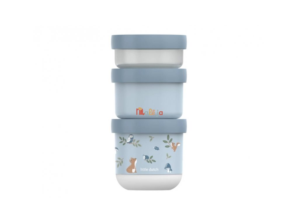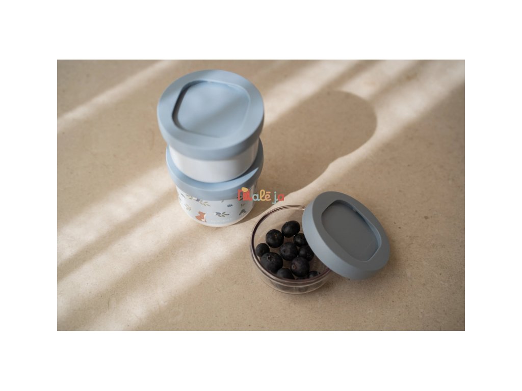 Tri praktické stohovateľné tégliky s viečkami sú ideálne na oddelené uloženie jednotlivých častí detskej desiaty. Spoľahlivé tesniace viečko chráni obsah pred vysypaním. Pre ľahké prenášanie sa tri tégliky pevne zacvaknú k sebe. Tégliky využijete na prechádzkach, výletoch aj doma.