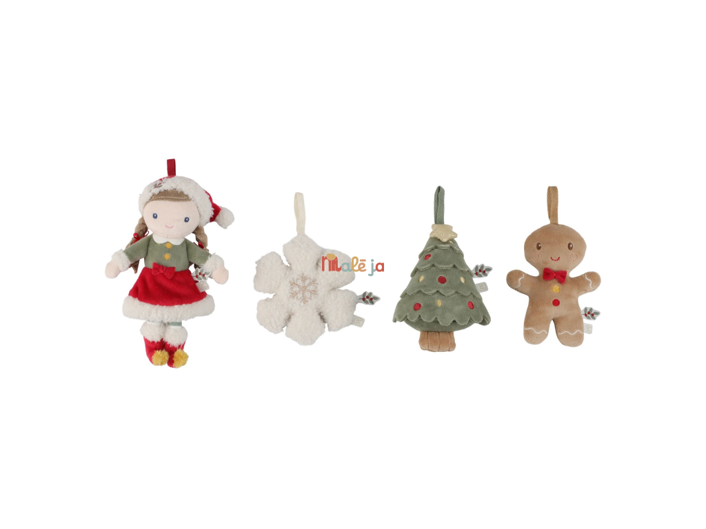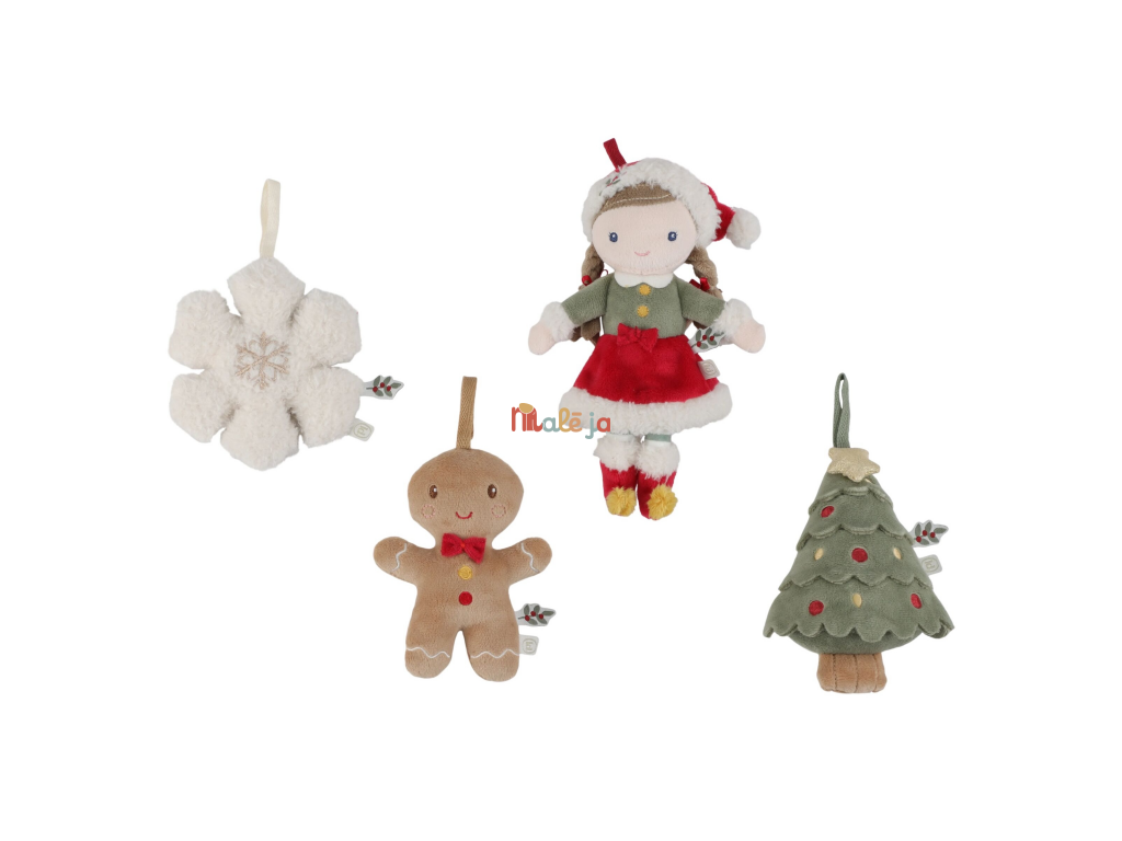Rozkošná sada štyroch plyšových ozdôb Little Dutch vnesie do vášho domova hrejivú atmosféru Vianoc. V darčekovom balení nájdete bábiku Rosu vo vianočnom oblečení, usmievavého perníčka, vianočný stromček a snehovú vločku. Vďaka mäkkému a ľahkému materiálu sú ozdoby bezpečné pre malé deti a ľahko sa vešia na vianočný stromček, vetvičku alebo girlandu. Spoločné zdobenie stromčeka sa tak stane kúzelným rodinným okamihom, ktorý si budete užívať rok čo rok.