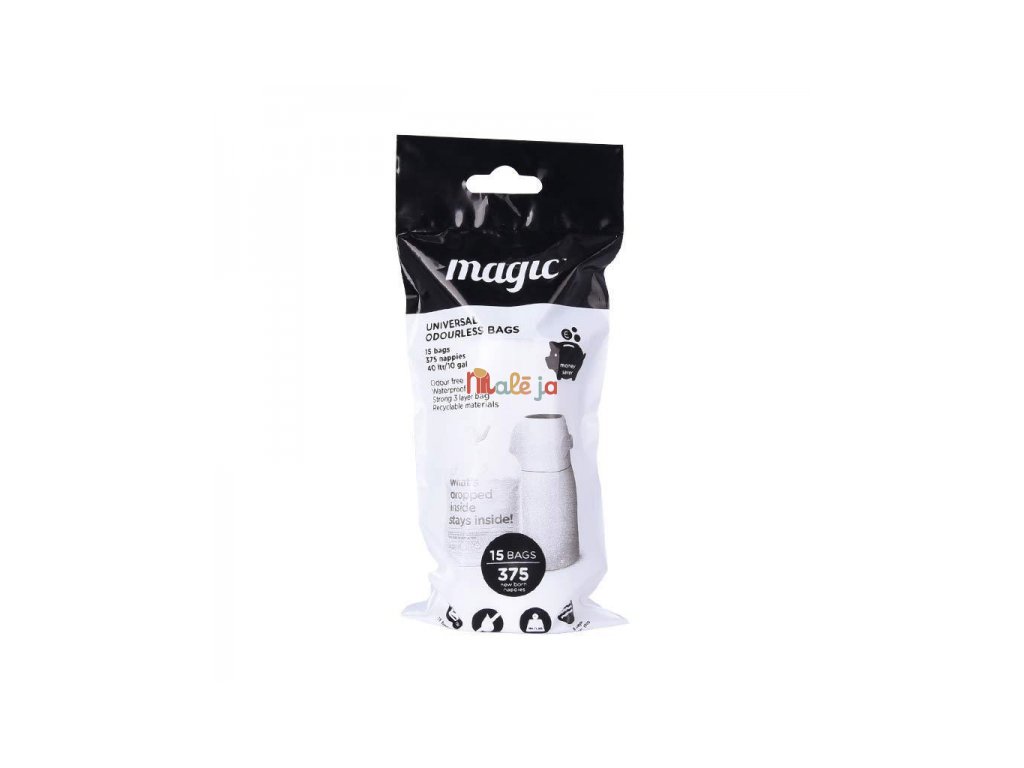 Univerzální sáčky do košů na pleny Magic. 3-vrstvý extra silný materiál brání protékání a chrání před šířením zápachu. Balení obsahuje 15 ks sáčků, vystačí přibližně pro 375 ks plen pro novorozence (počet plen záleží na jejich velikosti). Vyrobeno z recyklovaného materiálu.