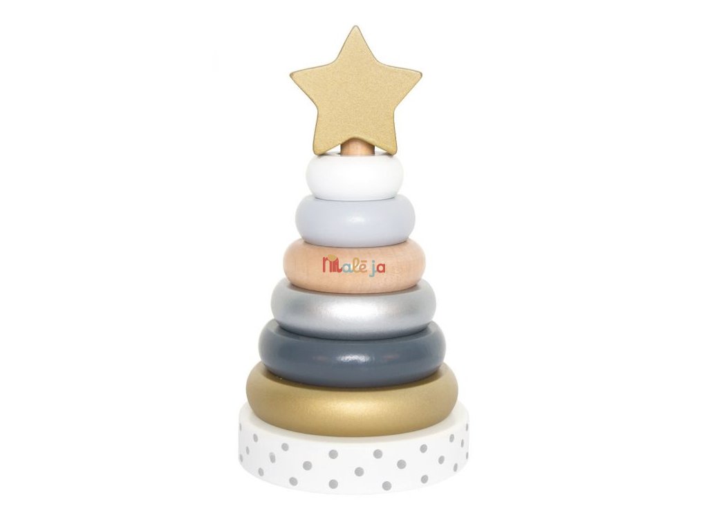 Táto hračka patrí medzi klasické hračky. Ide len o to, aký dizajn si vyberiete. Táto pyramída je tvorená niekoľkými odtieňmi striebornej a zlatej farby a ukončená hviezdou z prírodného dreva. Je krásnym dekoratívnym prvkom detskej izby.