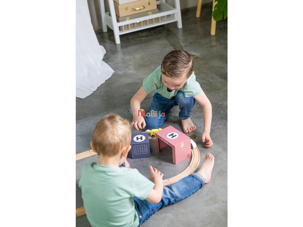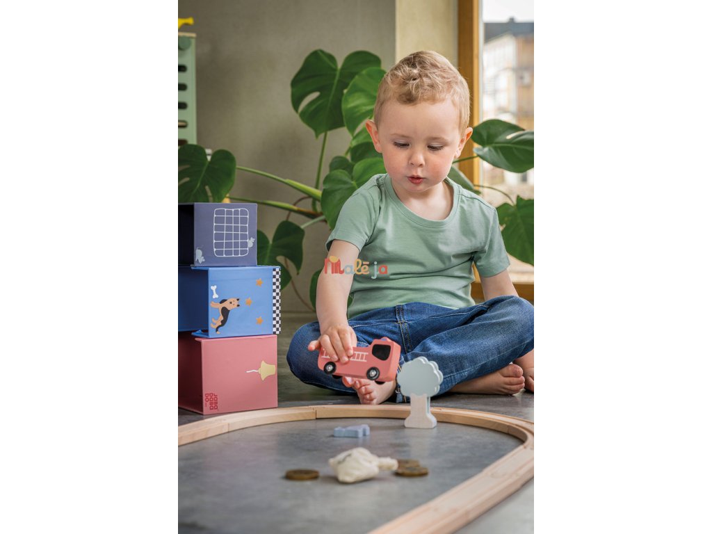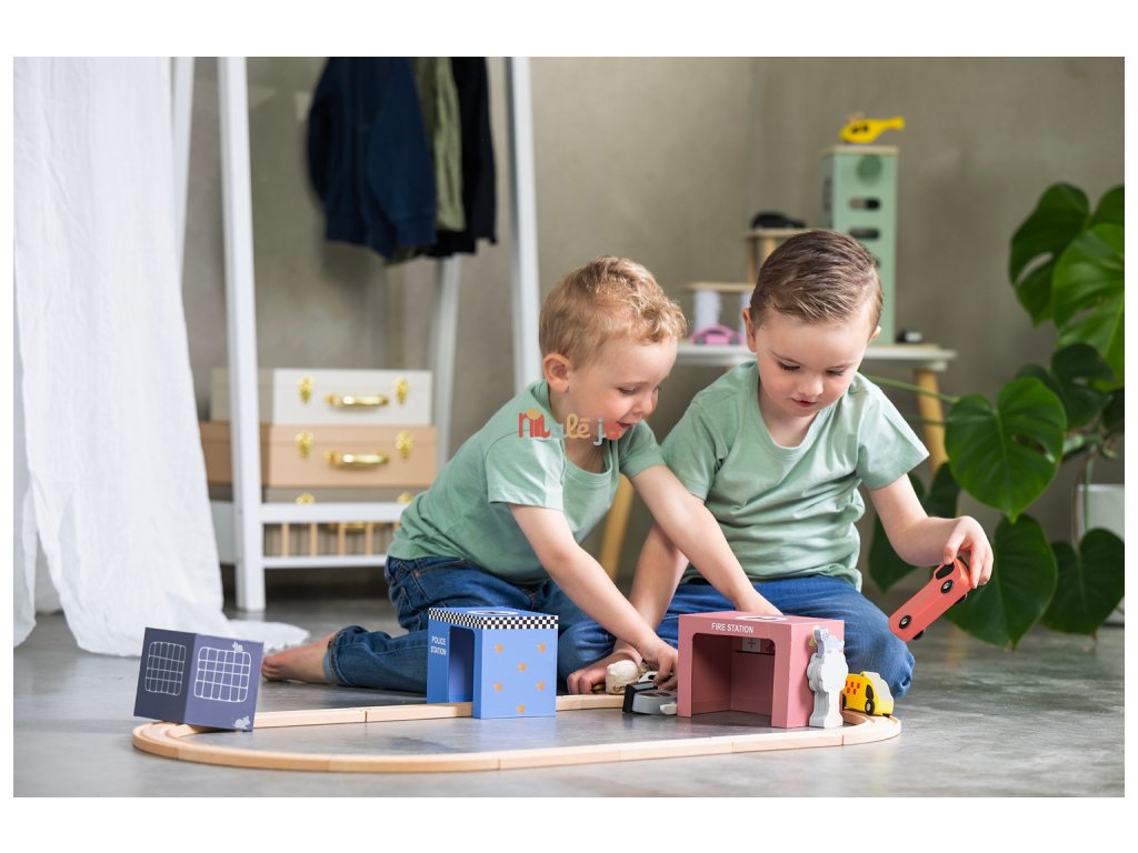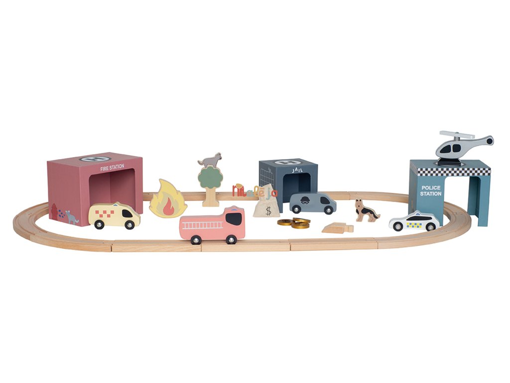 Čas bojovať s ohňom! Klasické drevené koľajnice Jabadabado so záchrannými vozidlami obsahuje policajnú stanicu, požiarnu stanicu a väzenie. Postavte spolu koľajnice a umiestnite tri domy pozdĺž cesty, autá môžu jazdiť cez policajnú stanicu. Policajné auto a helikoptéra pátrajú po zlodejoch, ktorí zrejme ukradli peniaze! Keď zlodejov chytia, vezmete ich do väzenia. Keď sa naháňačka skončí, pristaňte s helikoptérou bezpečne na heliporte jedného z troch domov. Ach nie, zdá sa, že mačka vyliezla na strom a nemôže zliezť. Ponáhľaj sa a choď tam s hasičským autom pomôcť mačke opäť dole na zem. Smola sa však neskončila, teraz sa zdá, že vypukol požiar. Hasičské auto je na ceste to uhasiť. Uf, konečne sa zdá, že v meste je pokoj a ticho. Teraz môžu autá pokojne hliadkovať pozdĺž koľajníc a čakať na nové dobrodružstvá. Vláčik podporuje kreatívnu hru a zaručene zabaví dieťa na celé hodiny. Možno kombinovať s garážou Jabadabado, ako aj inými koľajnicami pre vlak a autá od Jabadabada a iných známych značiek na trhu.