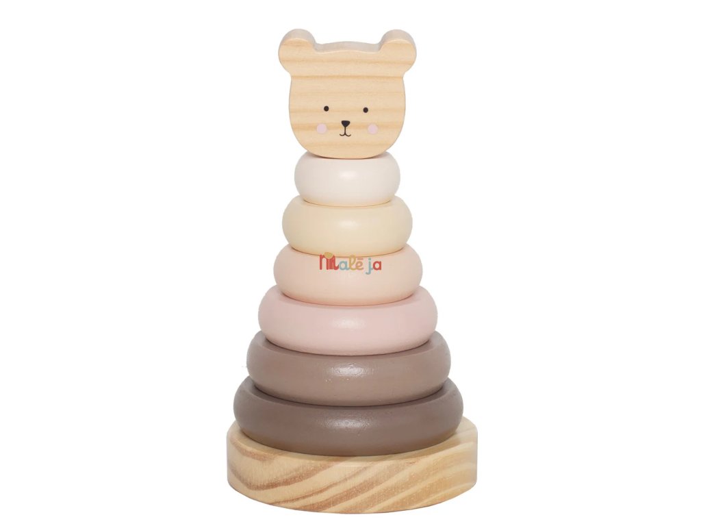 Stohovacia veža má navliekací drevený kolík, ktorým navliekate krúžky rôznej farby a veľkosti.