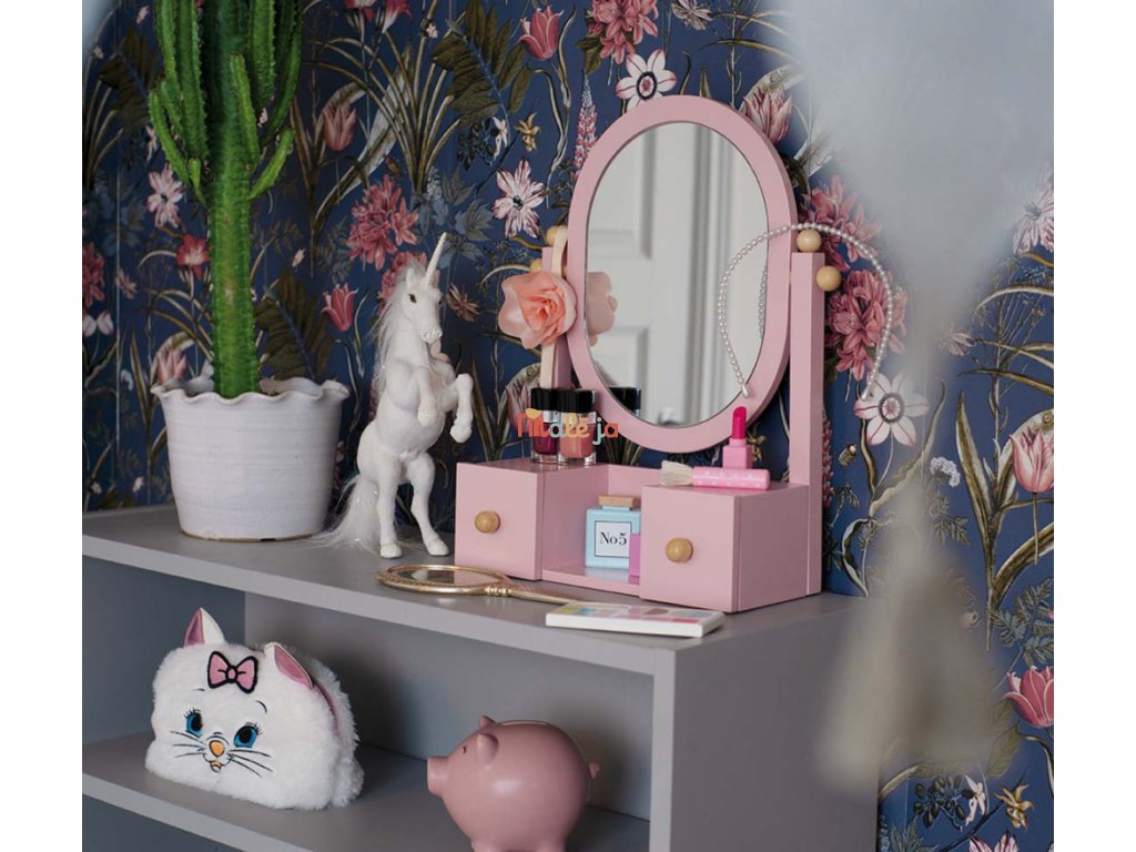 Toaletné zrkadlo má dve malé zásuvky a zrkadlo, ktoré môžete nakláňať dopredu a dozadu.