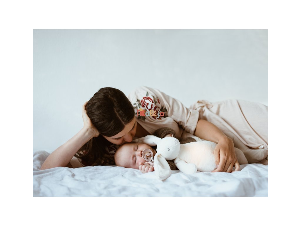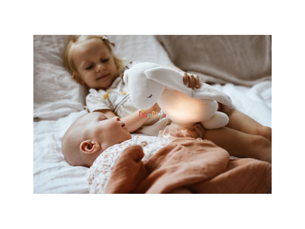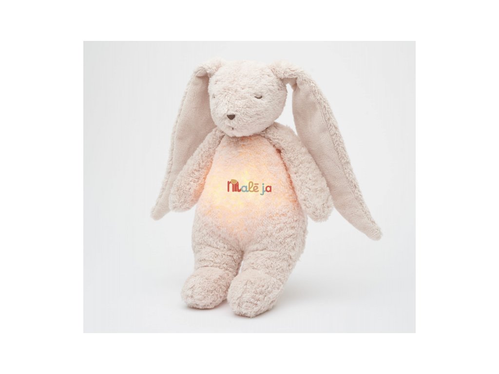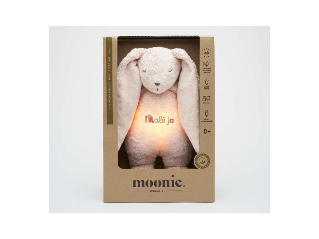 Moonie uspávačik v podobe rozkošného zajačika s nočným svetlom a relaxačnými zvukmi pomáha bábätku upokojiť sa a ľahšie zaspať. Upokojujúce zvuky pripomínajú dieťaťu prostredie v maternici mamičky pred jeho narodením. Uspávačik ponúka päť prírodných relaxačných zvukov (tlkot srdca, vietor, lesný potok, morské vlny, dážď), kalimba uspávanku, dve klasické uspávanky a umožňuje nahranie vlastného hlasu. Bruško zajačika svieti a slúži ako nočné svetlo s výberom siedmich farieb svietenia. Jemné svetlo pomáha dieťaťu cítiť sa v postieľke bezpečne. Svetlo je možné zapnúť aj bez zvukov. Pri zapnutej funkcii Shake svetlo zapnete zatrasením hračkou. Zajačik sa pri svietení nijako nezahrieva a je pre dieťa úplne bezpečný. Funkcia časovača umožňuje nastaviť dobu prehrávania na 30, 60 alebo 90 minút, než modul prejde do režimu inteligentného senzora plaču. Inteligentný senzor aktivuje zvuk a svetlo, keď dieťa začne plakať. Hračka potom prehráva relaxačné zvuky a jemne svieti po dobu 20 minút. Hudobný modul umožňuje nastavenie hlasitosti a doby prehrávania podľa vašich preferencií. Hračka sa dobíja s pomocou USB kábla, na plné nabitie potrebuje 3 hodiny. Plne nabitá batéria vydrží až 8 hodín nepretržitej prevádzky so zapnutým svetlom a zvukom.USB kábel je súčasťou balenia. Po vybratí zvukového a svietiaceho modulu môžete hračku prať v ruke. Zajačik je súčasťou produktovej rady Moonie Organic, vyrábanej z cetifikovanej organickej bavlny, farbenej netoxickými farbami. Bavlna pochádza z produkcie bez použitia pesticídov a toxických hnojív. Pri pestovaní organickej bavlny sa používa o 50% menej vody v porovnaní s priemyselným pestovaním.Výplň hračky tvorí recyklovaný materiál. Hračka bola testovaná švajčiarskym laboratóriom SGS a je v súlade so smernicou 2009/48/ES o bezpečnosti hračiek. Rozmery: 28 x 16 x 10,5 cm Vhodné pre deti od narodenia.
