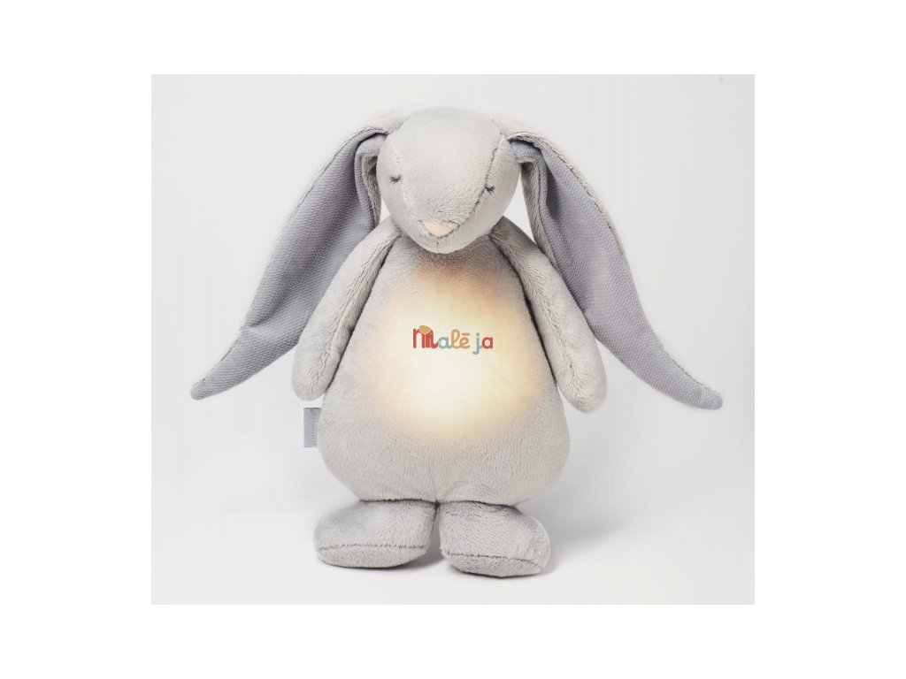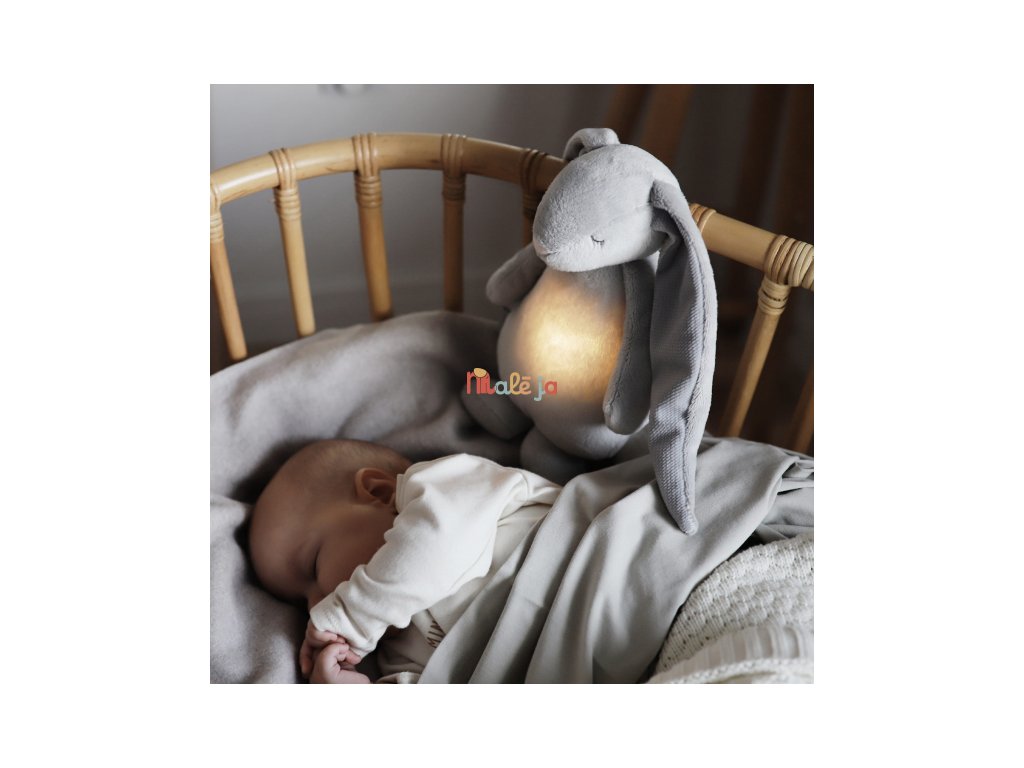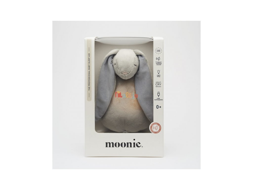 Moonie uspávačik v podobe rozkošného zajačika s nočným svetlom a relaxačnými zvukmi pomáha bábätku upokojiť sa a ľahšie zaspať. Upokojujúce zvuky pripomínajú dieťaťu prostredie v maternici mamičky pred jeho narodením. Uspávačik ponúka päť prírodných relaxačných zvukov (tlkot srdca, vietor, lesný potok, morské vlny, dážď), kalimba uspávanku, dve klasické uspávanky a umožňuje nahranie vlastného hlasu. Bruško zajačika svieti a slúži ako nočné svetlo s výberom siedmich farieb svietenia. Jemné svetlo pomáha dieťaťu cítiť sa v postieľke bezpečne. Svetlo je možné zapnúť aj bez zvukov. Pri zapnutej funkcii Shake svetlo zapnete zatrasením hračkou. Zajačik sa pri svietení nijako nezahrieva a je pre dieťa úplne bezpečný. Funkcia časovača umožňuje nastaviť dobu prehrávania na 30, 60 alebo 90 minút, než modul prejde do režimu inteligentného senzora plaču. Inteligentný senzor aktivuje zvuk a svetlo, keď dieťa začne plakať. Hračka potom prehráva relaxačné zvuky a jemne svieti po dobu 20 minút. Hudobný modul umožňuje nastavenie hlasitosti a doby prehrávania podľa vašich preferencií. Hračka sa dobíja s pomocou USB kábla, na plné nabitie potrebuje 3 hodiny. Plne nabitá batéria vydrží až 8 hodín nepretržitej prevádzky so zapnutým svetlom a zvukom.USB kábel je súčasťou balenia. Po vybratí zvukového a svietiaceho modulu môžete hračku prať v práčke. Moonie zajačik je vyrobený z najkvalitnejších, certifikovaných a bezpečných materiálov pre deti. Hračka bola testovaná švajčiarskym laboratóriom SGS a je v súlade so smernicou 2009/48/ES o bezpečnosti hračiek. Všetky materiály, z ktorých je zajačik MOONIE vyrobený, sú certifikované OEKO-TEX a sú super jemné a príjemné na dotyk. Rozmery: 28 x 16 x 10,5 cm Vhodné pre deti od narodenia.