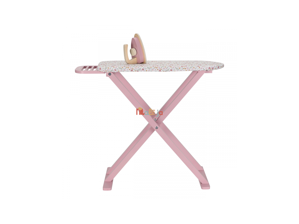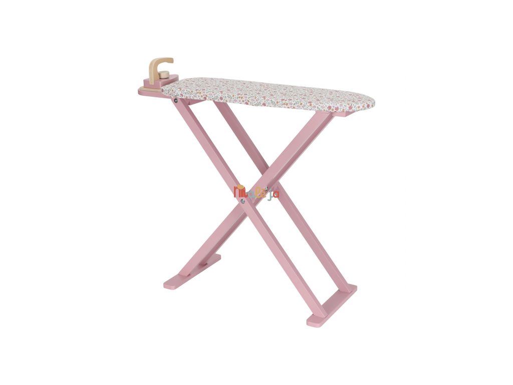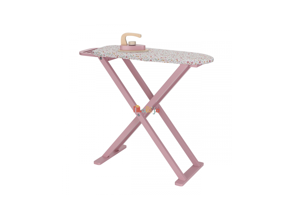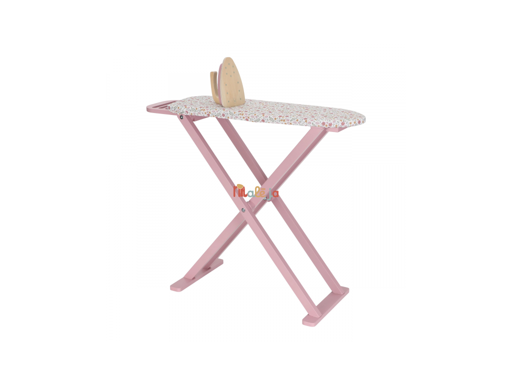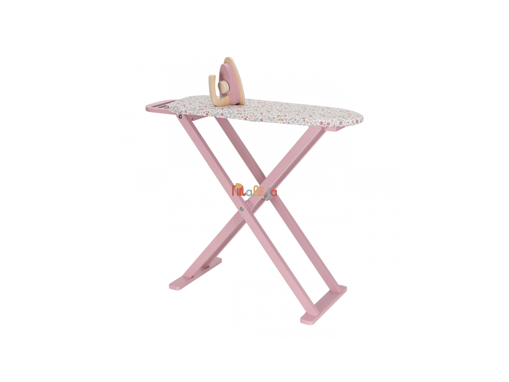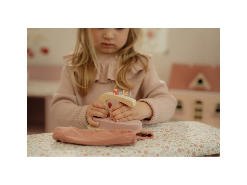 Žehlenie oblečenia bábikám bude radosť s touto krásnou drevenou žehliacou doskou a žehličkou. Skladacia doska je s textilným poťahom s nežnou kvetinovou potlačou vyzerá ako naozajstná, realisticky pôsobí aj farebne zladená drevená žehlička. Deti môžu hraním so žehličkou napodobňovať dospelých a spoznávať svet domácnosti zábavnou formou.