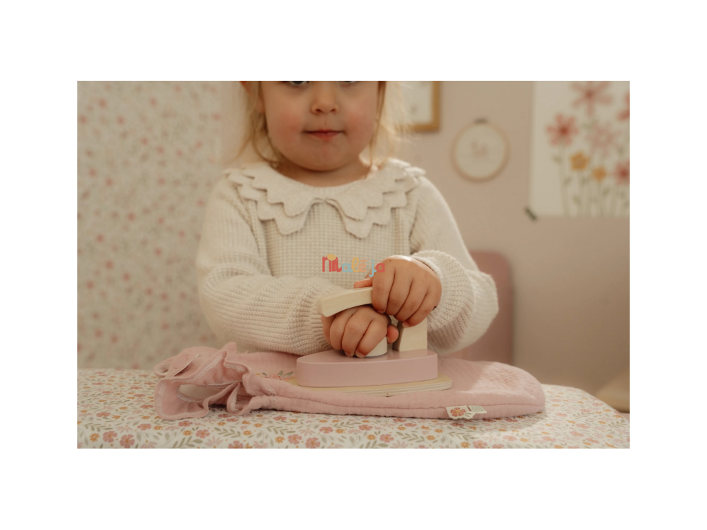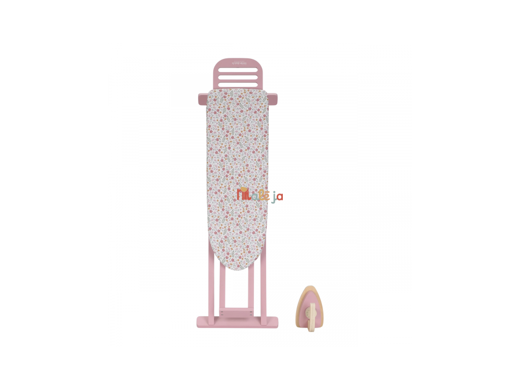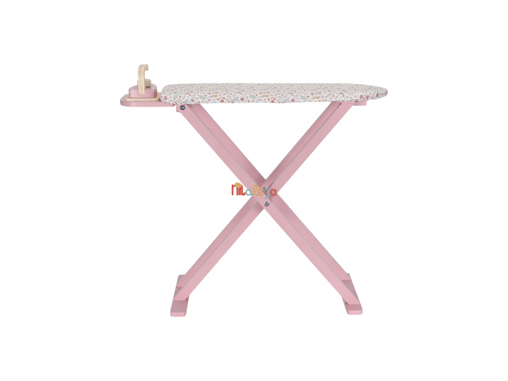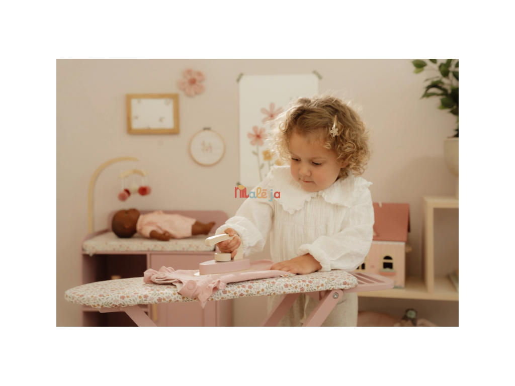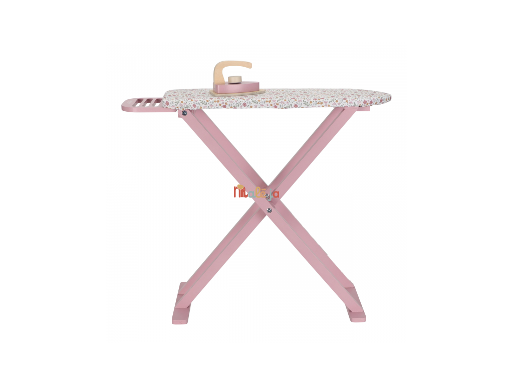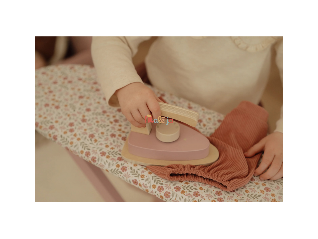 Žehlenie oblečenia bábikám bude radosť s touto krásnou drevenou žehliacou doskou a žehličkou. Skladacia doska je s textilným poťahom s nežnou kvetinovou potlačou vyzerá ako naozajstná, realisticky pôsobí aj farebne zladená drevená žehlička. Deti môžu hraním so žehličkou napodobňovať dospelých a spoznávať svet domácnosti zábavnou formou.