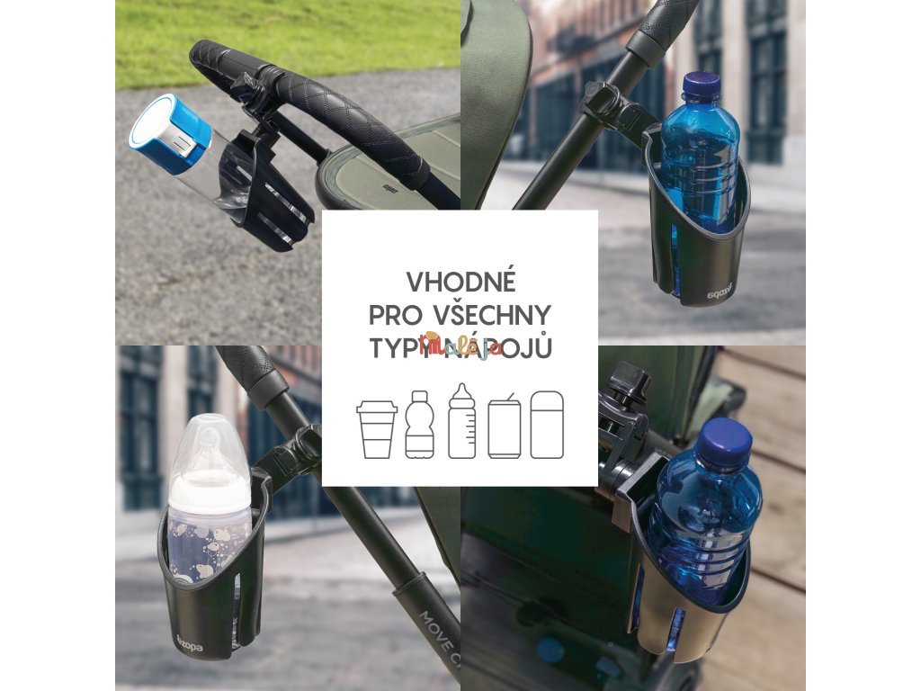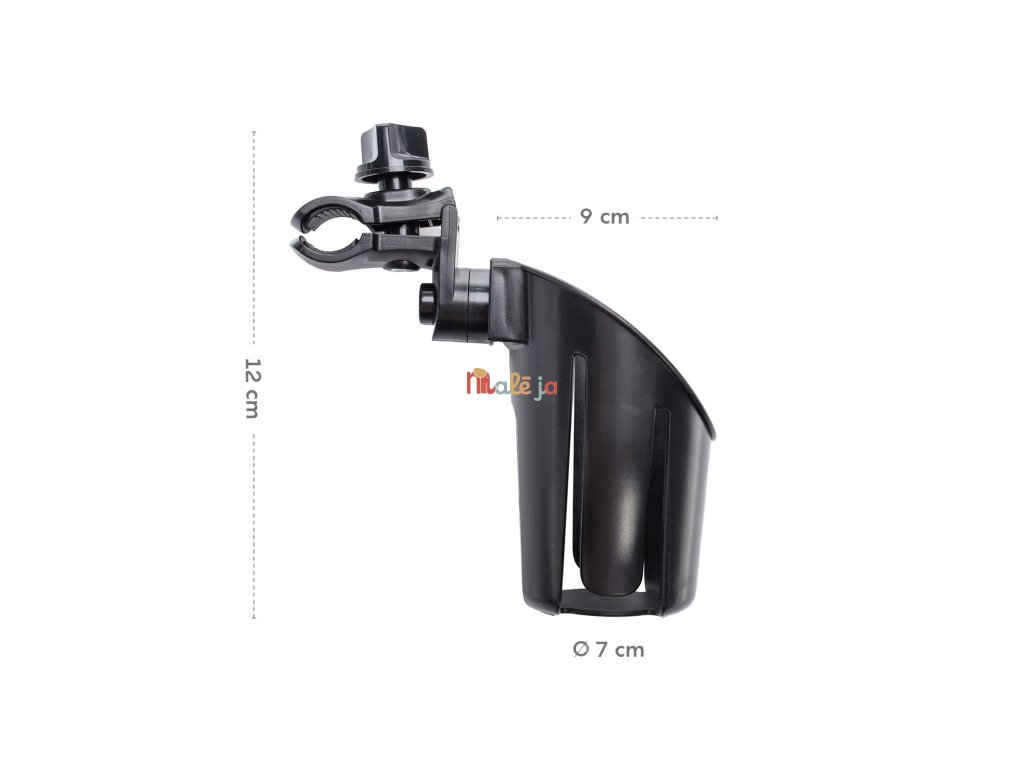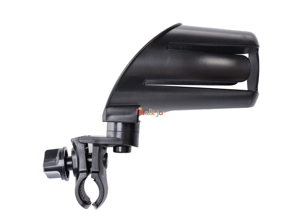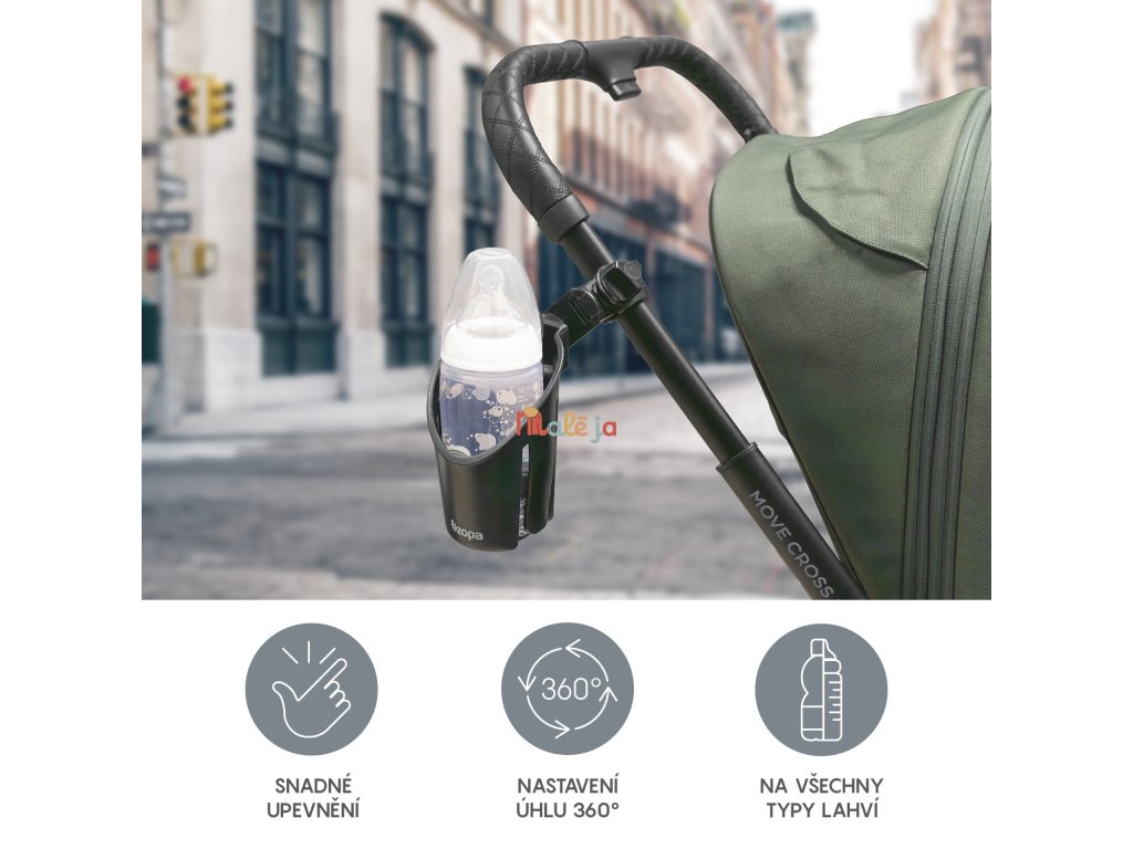 Držiak na fľašu s pitím vhodný na väčšinu typov kočíkov, ale aj na detské bicykle, kočíky pre bábiky a pod. Klapky drží fľašu pevne na svojom mieste a vďaka tlačidlám možno držiak nastaviť do potrebného uhla. Jednoducho sa pripevňuje aj odníme.