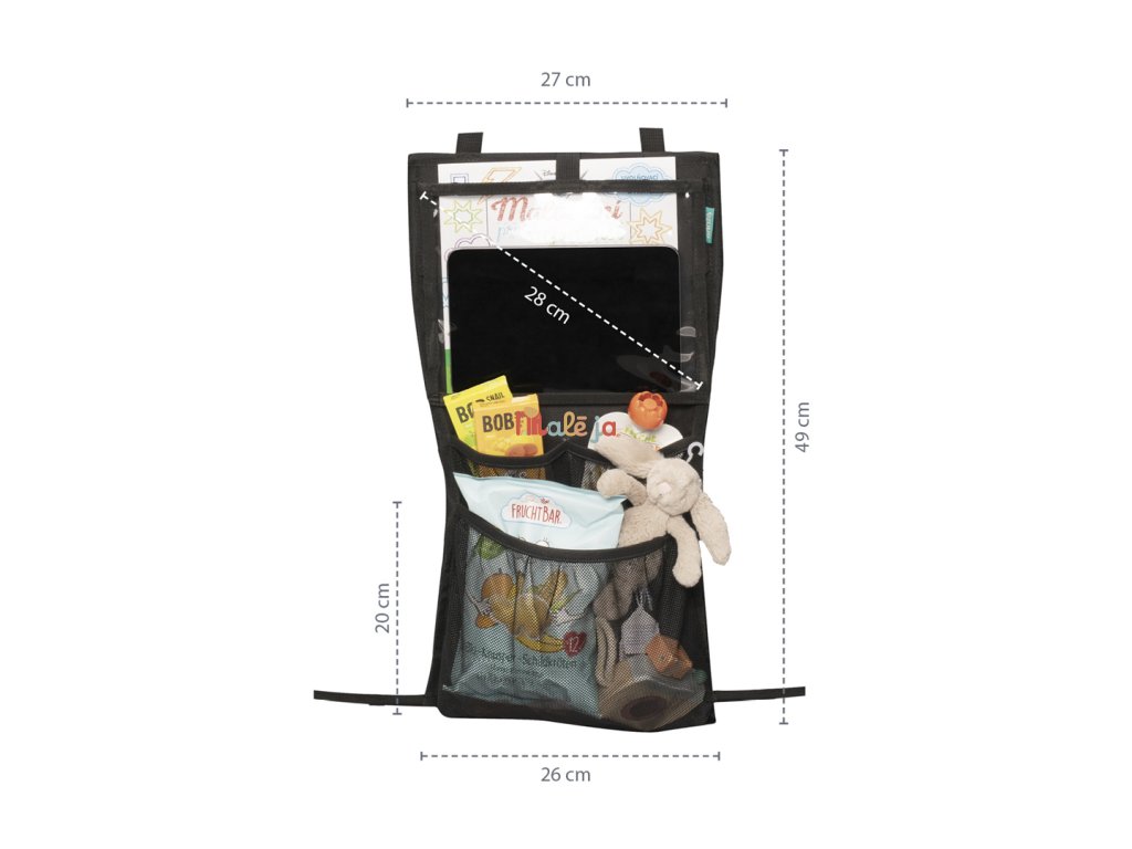 Chytrý a efektívny organizér na sedadlo auta spríjemnia cestu nielen vám, ale vďaka vrecku na tablet tiež vašim deťom, ktoré sa môžu zabaviť sledovaním rozprávok. Vrecko na tablet je veľká, takže možno umiestniť tablet s uhlopriečkou až 24 cm. Dve hlboké vrecká na ďalšie predmety, ako sú napríklad hračky, robia z organizéra príjemnú cestovnej pomôcku, ktorá pomôže udržať poriadok vo vozidle aj pri cestovaní s vašimi najmenšími. Organizér sa vďaka prackám ľahko pripevní na zadnú stranu sedadla a ľahko ho tiež odoberiete.