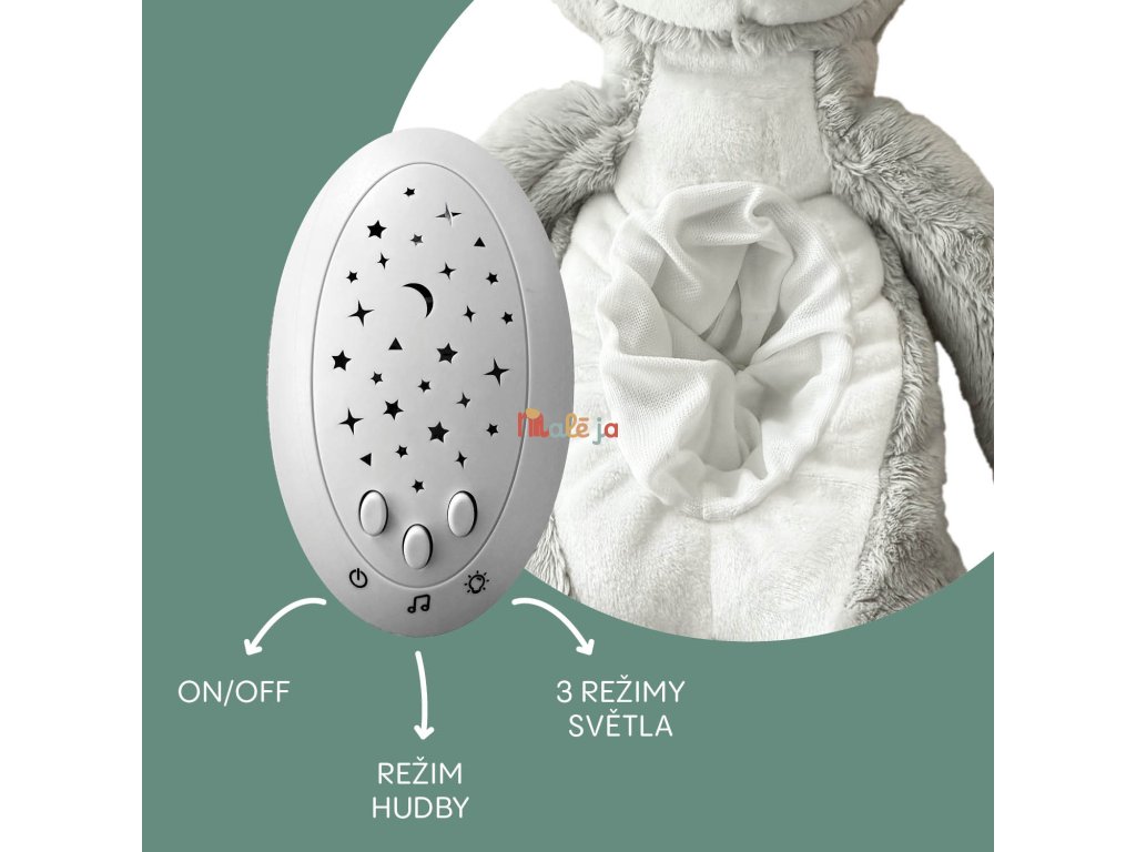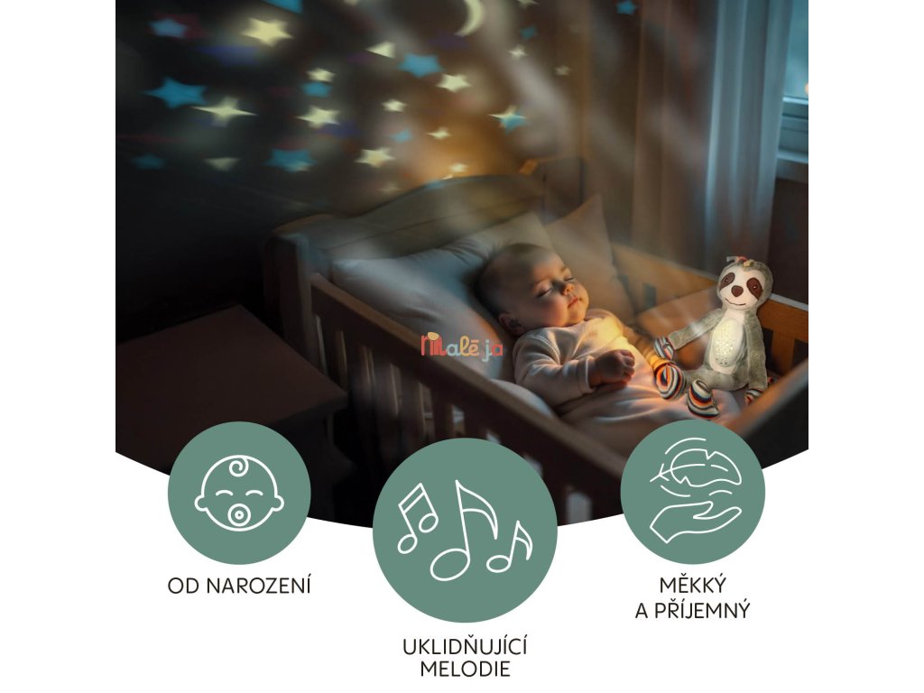 Nočné svetielko premieta kúzelné motívy na stenu a plynule sa meniace RGB farby vytvárajú harmonickú atmosféru. K tomu sa pridáva 10 upokojujúcich melódií, ktoré navodzujú pocit bezpečia a pohody pre pokojné a nerušené zaspávanie.