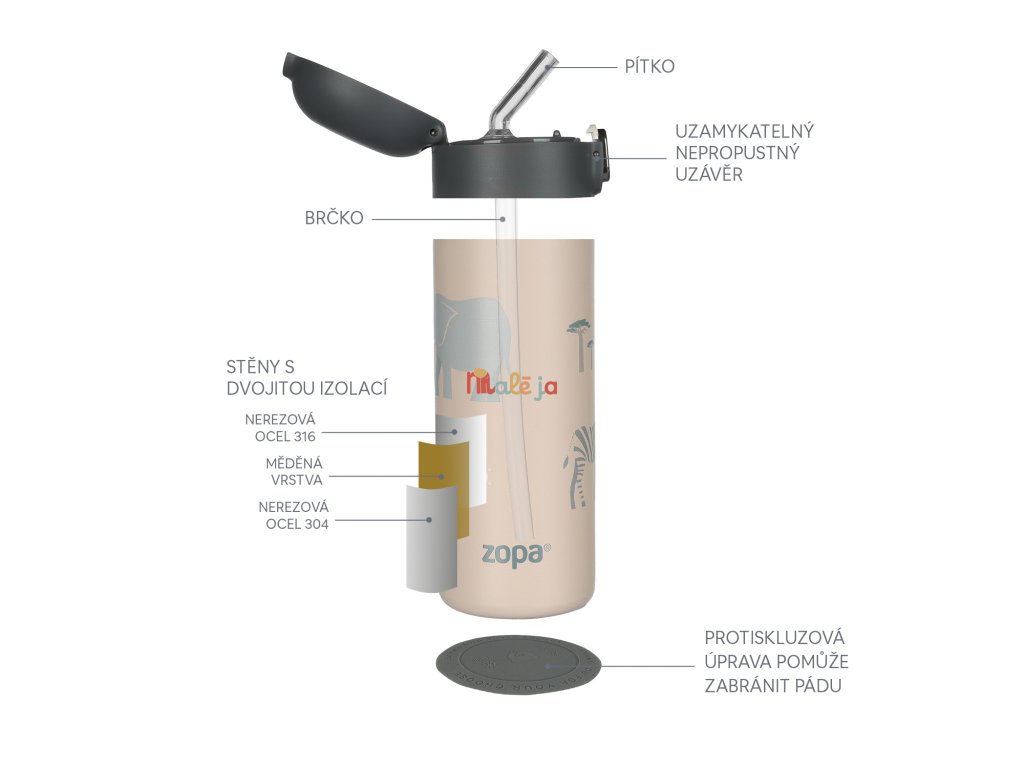 Tesné viečko zaisťuje, že z termosky neunikne ani kvapka a nemusíte mať tak obavu z jej vyliatia. Súčasťou je aj mäkké silikónové náustok v tvare slamky, ktoré deti tak zbožňujú.