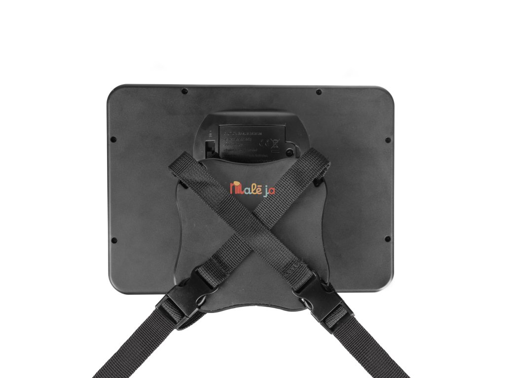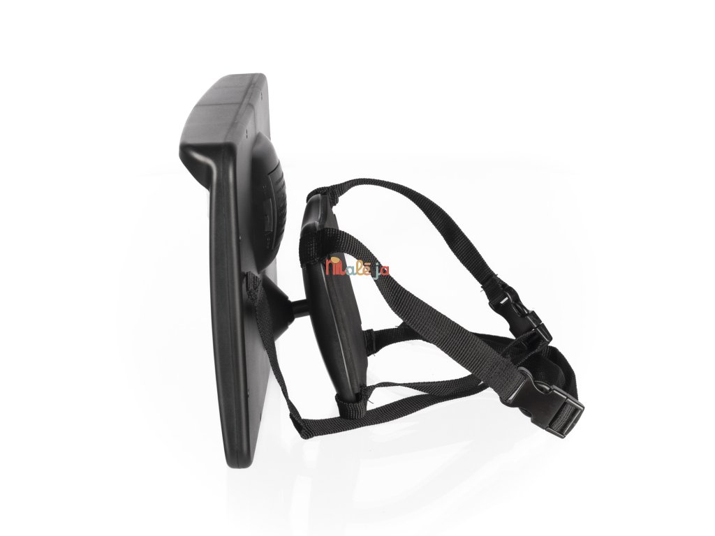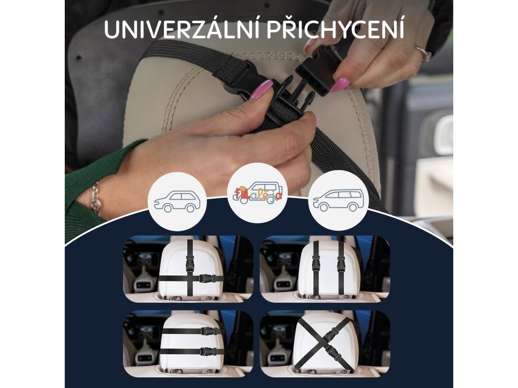 jednoducho sa upevňuje na opierku hlavy pomocou nastaviteľných popruhov. Je